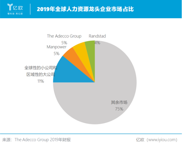 國外靈活用工市場發(fā)展至今已有一百多年,在最早的發(fā)源地歐美、日本等發(fā)達(dá)國家已相當(dāng)成熟,但與人力資源市場一樣,靈活用工市場非常分散。2019年,頭部前三的龍頭企業(yè)Manpower、The Adecco Group和Randstad在人力資源市場上的總市占率僅為14%。