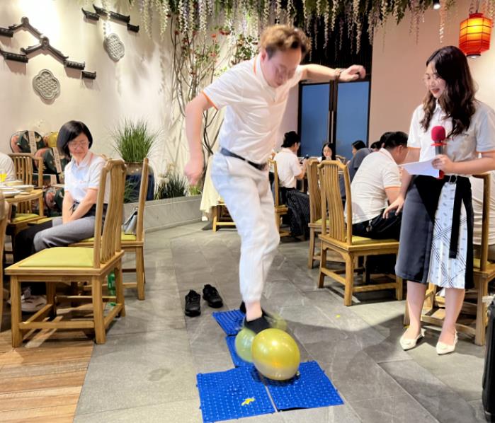 活動(dòng)伊始,升級(jí)版“光腳指壓板踩氣球”游戲就讓大家為之顫抖。腳掌與指壓板的親密接觸,喚起身體最原始的感觸,在痛并快樂(lè)的游戲氛圍中,感受腳掌的“自我折磨”,在痛苦中,考驗(yàn)大家斗智斗勇的智慧與敢于挑戰(zhàn)的勇氣。