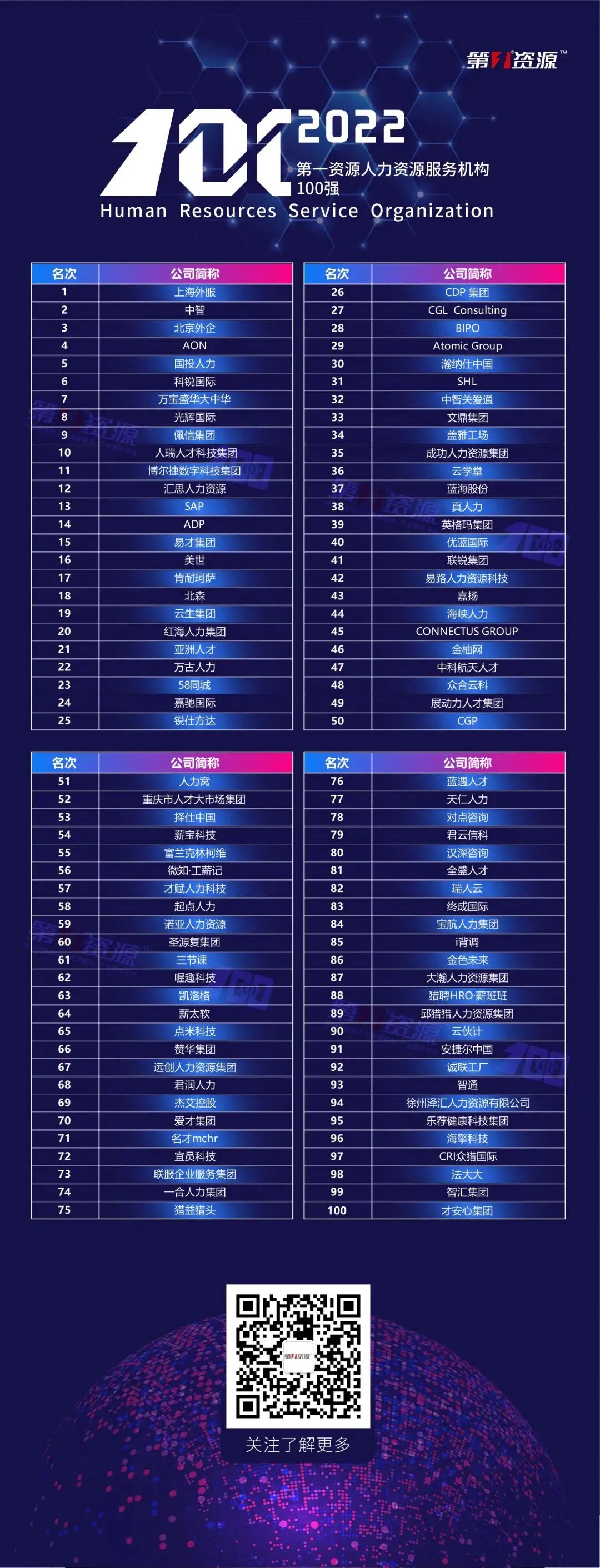 2022年7月8日,由人力資源第三方媒體“第一資源”舉辦的“2022中國(guó)人力資源服務(wù)機(jī)構(gòu)TOP100強(qiáng)”頒獎(jiǎng)典禮在上海隆重舉行。